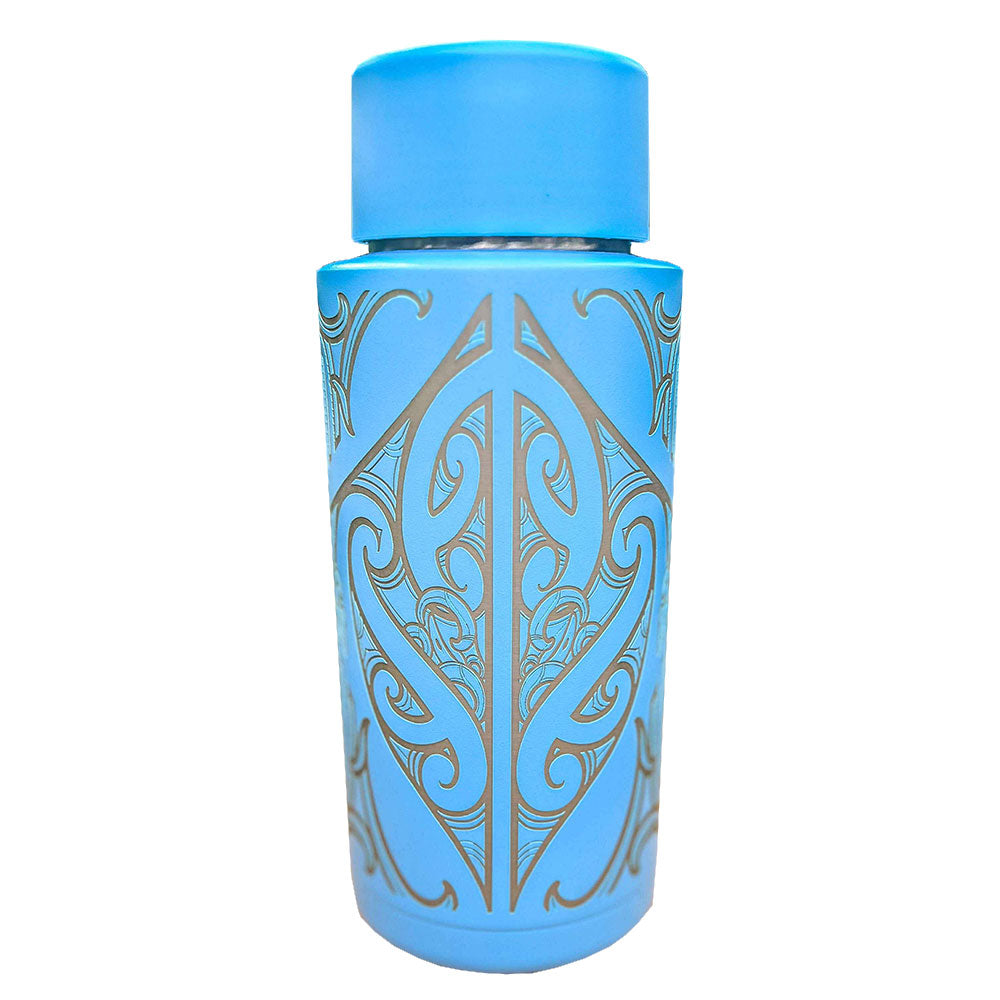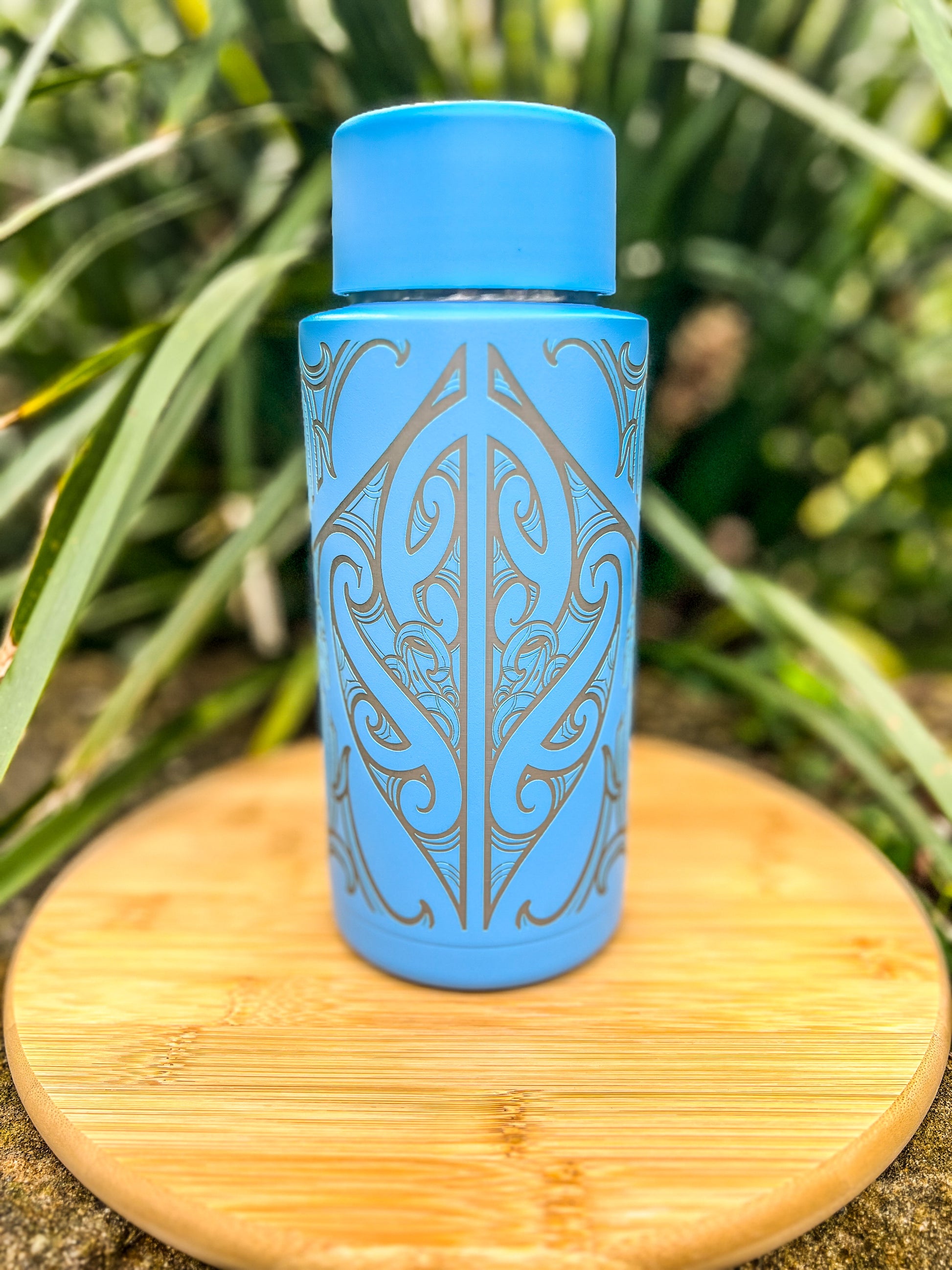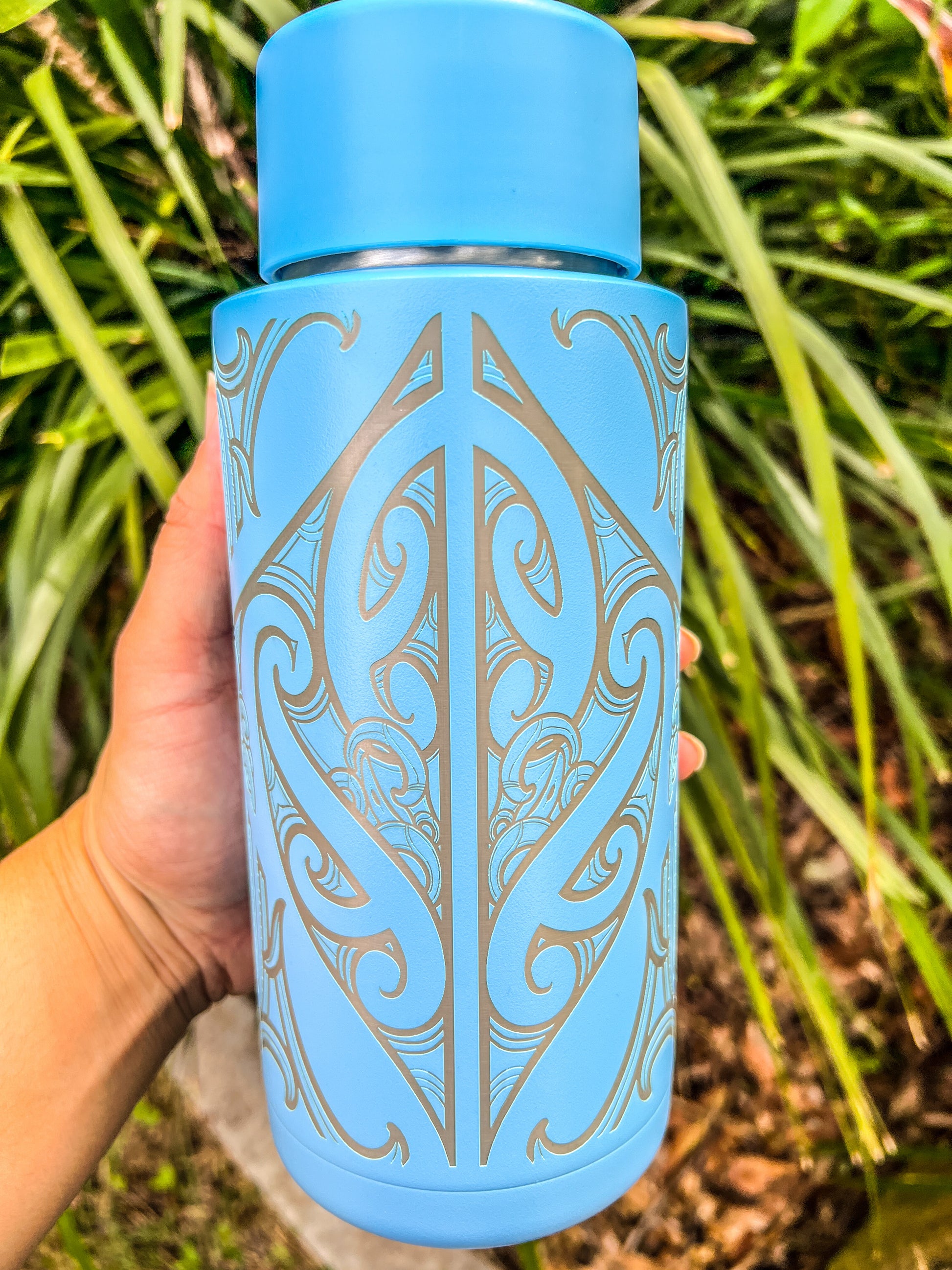 This design marks the moment Tāne receives his first blessing in the waiora, the sacred waters of knowledge and life, symbolising the flow of mauri and the pursuit of higher understanding. It is a reminder to honour our own ascent, our own sacred journey, every time we hydrate.